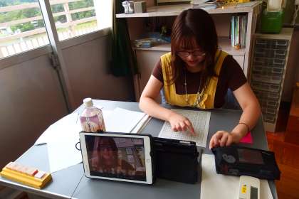 タブレットを使ったオンライン出校日に参加できている児童の確認をしている担任の先生です。