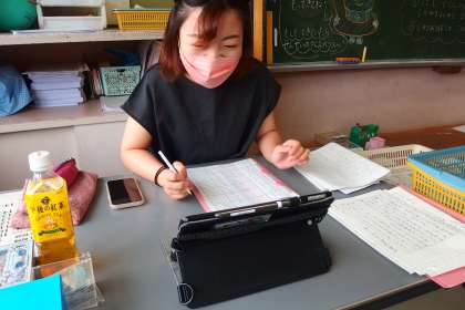 8月22日の東広瀬小学校(12) 公開日 2022/08/23 更新日 2022/08/23 活動の様子 タブレットのアプリの Microsoft Teams を使ってオンライン出校日を行いました。 タブレット越しではありますが、元気そうな子どもたちに一人一人話しかけている1年生の担任の先生です。