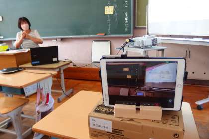 この研修に別の場所から参加している先生のために、タブレットを使ってリモートでつなぎました。