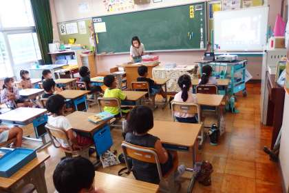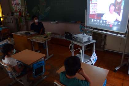 リモート配信で実施した全校集会に各教室で参加している様子です。
