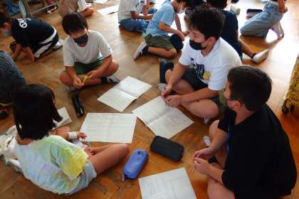 インタビュー活動のまとめをグループでシェアしている学び合いの場面です。