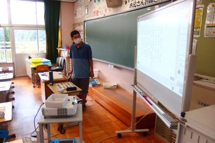 デジタル教科書をスクリーンに映し、全員で一緒に考えています。