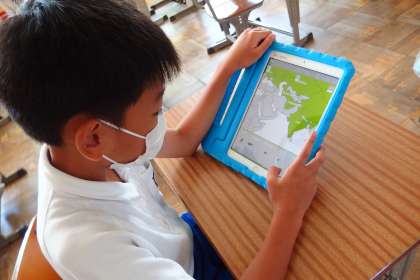 タブレットのアプリで復習をしている4年生です。
