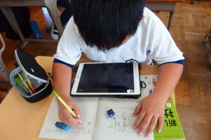 本日の給食が「とよたブランドの日」なのに合わせて、給食の食材の産地が日本国内のどの地域で多いのか、タブレットを使って調べている5年生です。