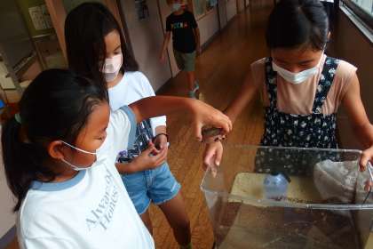 生き物大好きな3年生が、クワガタの飼育ケースの手入れをしていました。 タブレットで撮影しています。