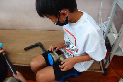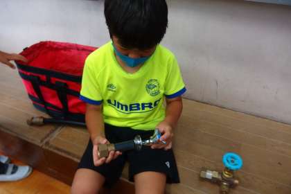 午前中の上水道講座を受けて、水道管や検診メーターに興味津々の4年生男子のみなさんです。