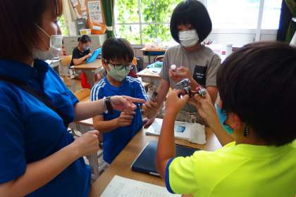午前中の上水道講座を受けて、水道管や検診メーターに興味津々の4年生のみなさんです。