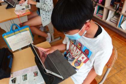 タブレットを駆使して、修学旅行の下調べをしている6年生です。
