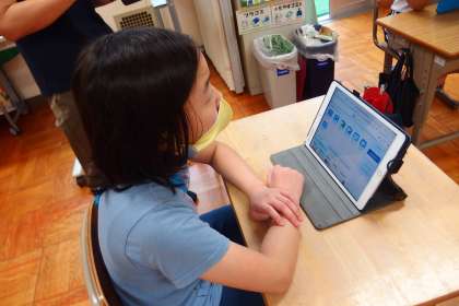 タブレットに健康観察の結果を入力している4組の子です。
