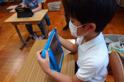 タブレットに健康観察の結果を入力している2組の子です。
