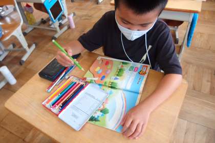 教科書に色鉛筆でrainbow(虹)を描いているところをタブレットで撮影しました。