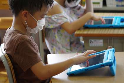 タブレットに健康観察を入力する1年生です。