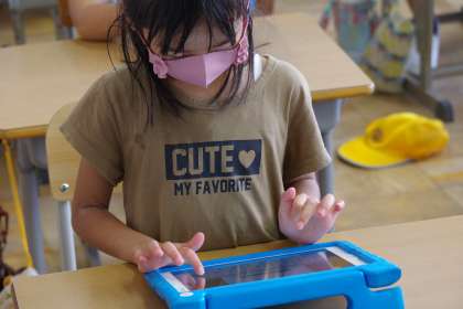 タブレットでひらがなやカタカナの復習をしている1年生です。
