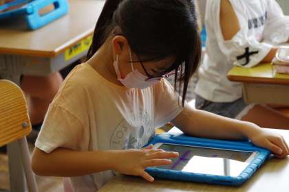 タブレットでひらがなやカタカナの復習をしている1年生です。