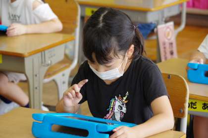 タブレットでひらがなやカタカナの復習をしている1年生です。