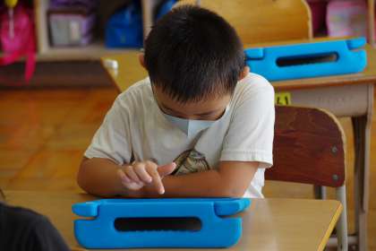 タブレットでひらがなやカタカナの復習をしている1年生です。