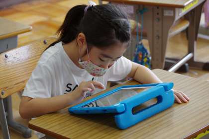 タブレットでひらがなやカタカナの復習をしている1年生です。