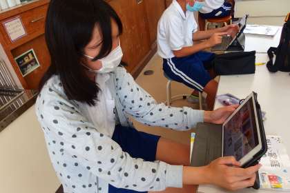 タブレットを使って復習をする6年生です。