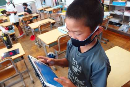 タブレットに健康観察を入力する5年生です。
