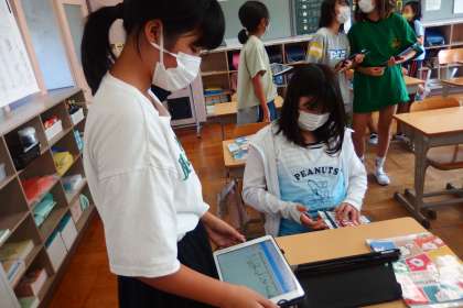 9月13日の東広瀬小学校(14) 公開日 2022/09/13 更新日 2022/09/13 活動の様子 6年生の英語の事業です。 タブレット上に英会話のネタを準備して、それをもとに友だちと会話練習をしているところです。