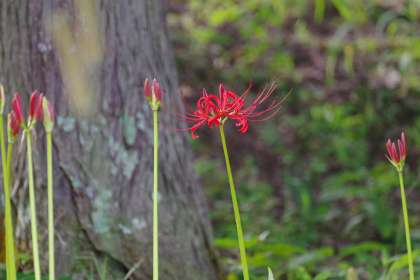 9月15日の朝、学校のおとなりの廣済寺の敷地内で、この秋初めてヒガンバナ(曼珠沙華)の咲いているのを見つけました。
