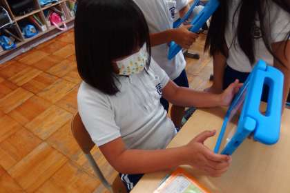 タブレットに健康観察を入力しているところです。