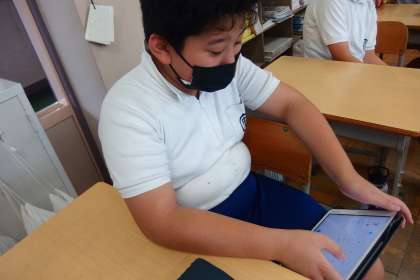 タブレットに健康観察を入力しているところです。