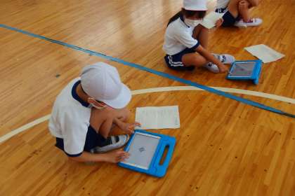 運動会の表現の準備、練習のために、体育館にタブレットを持参しています。
