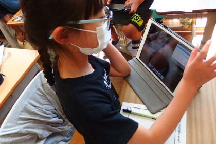 5年生の英語の授業です。 ALTの先生に話しかける英語をタブレットを使いながら考えています。
