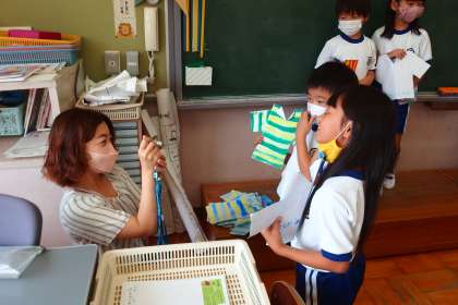 1年生が初めて絵の具を使って仕上げた記念の作品を、担任の先生がデジタルカメラで写真を撮っていました。