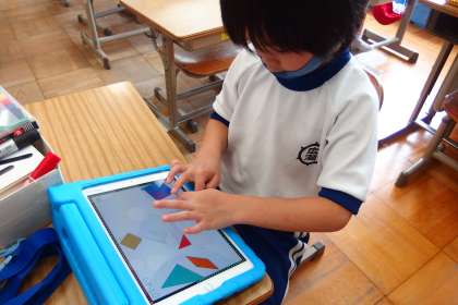 タブレットの図形のアプリを使う1年生です。