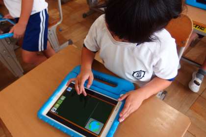 タブレットのアプリで国語の復習をしている1年生です。