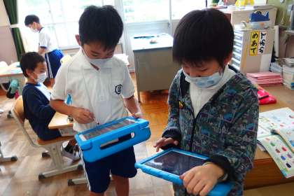 9月22日の東広瀬小学校(18) 公開日 2022/09/25 更新日 2022/09/25 活動の様子 3年生の英語の授業です。 英語での色の表現と動詞likeを学びました。 友だちと英語で会話しながら色のカードを交換するのですが、色のカードをタブレット上で扱ってみました。