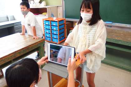 タブレットで動画を撮影している5年生です。