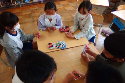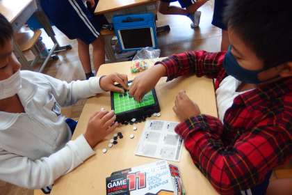 雨降りの日のレッツゴータイムは、教室の中で盛り上がります。 タブレットで撮影しています。