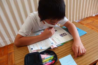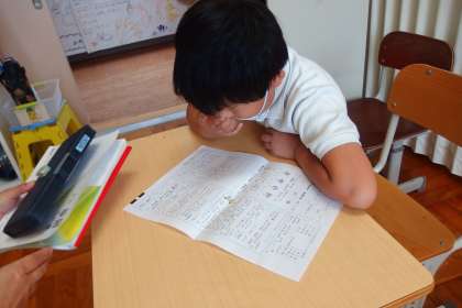 国語の授業をする2組の児童です。 タブレットで撮影しています。