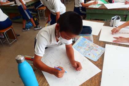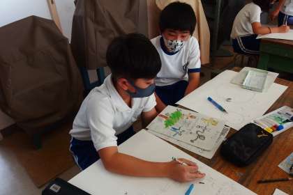 5年生の図工の授業です。 ポスターの製作を進めています。 タブレットで撮影しています。