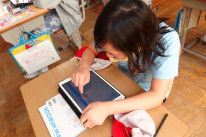 タブレットの発表ノート機能を使って、英語のメッセージカードを作成しています。