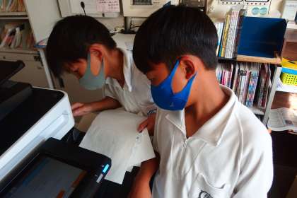 委員会の時間に、職員室でコピーを取る5年生です。