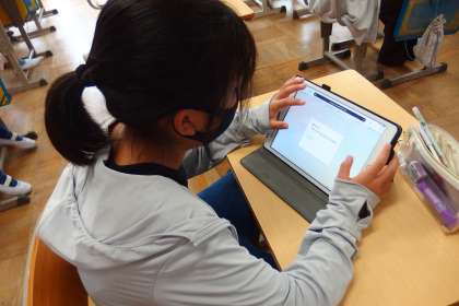 タブレットに健康観察を入力する6年生です。