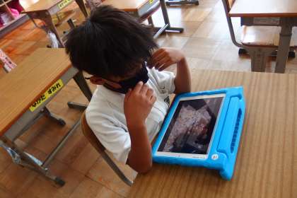 タブレットでザリガニの生態について熱心に調べている1年生です。