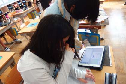 タブレットに健康観察を入力する6年生です。