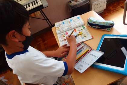 タブレットのデジタル教科書から流れる英語の聞き取りをしています。