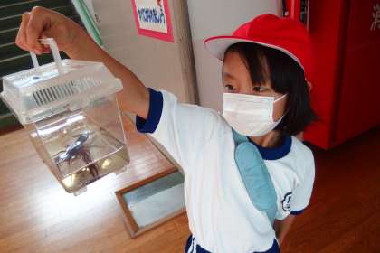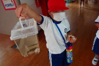 1年生のザリガニ釣りは第3弾。 釣れました! この写真はタブレットで撮影しています。