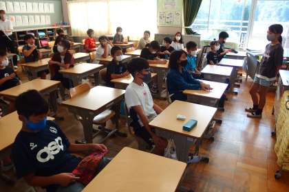 5年生の朝の会の様子です。 この写真はタブレットで撮影しています。