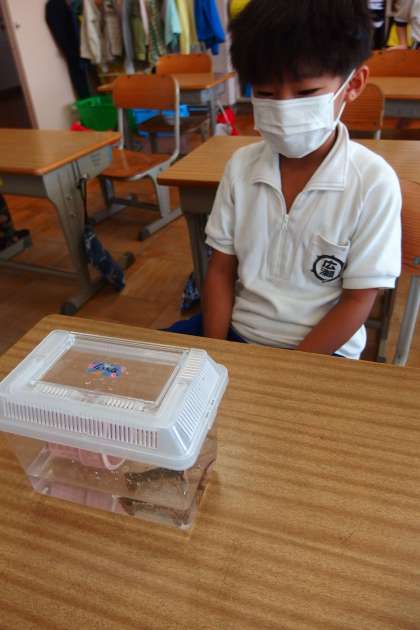 ザリガニの朝ごはんタイムです。 うれしそうな1年生。 この写真はタブレットで撮影しています。