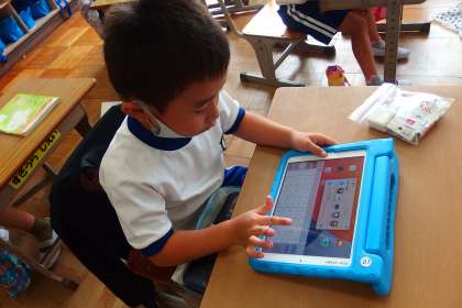 タブレットに健康観察を入力する1年生です。