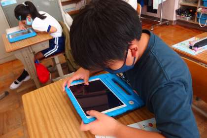 わかばタイムに、タブレットを使って学習を進める4年生です。