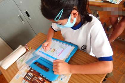 わかばタイムに、タブレットを使って学習を進める4年生です。