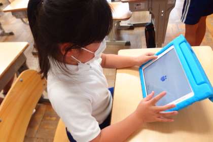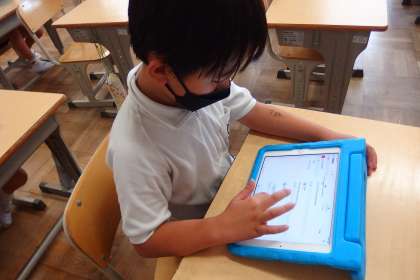 運動会の表現の練習の様子を撮影した動画をタブレットで見て、動きを確認している2年生です。